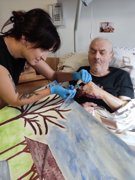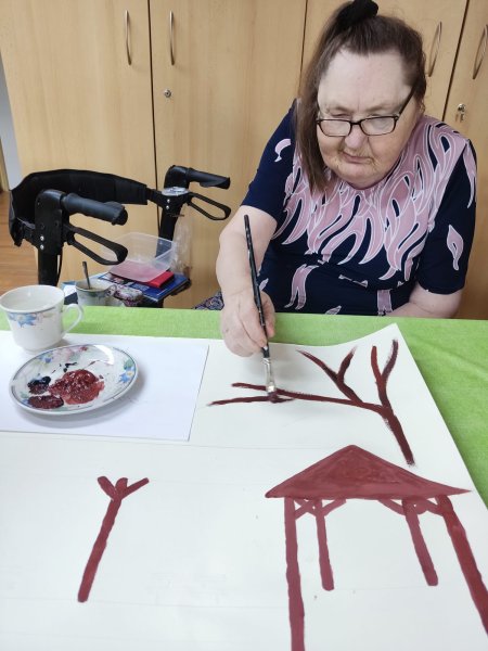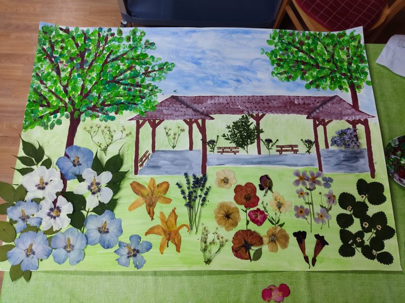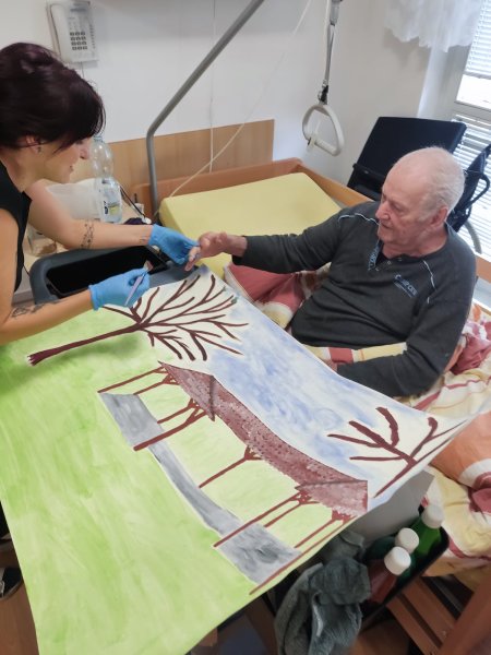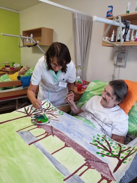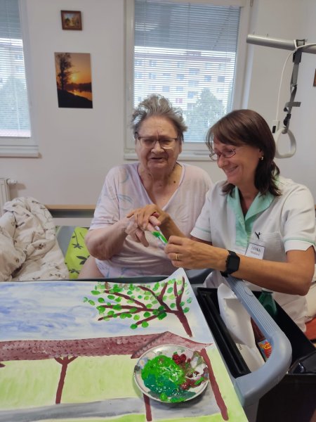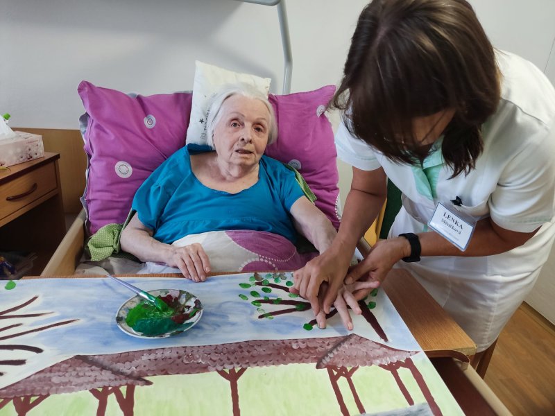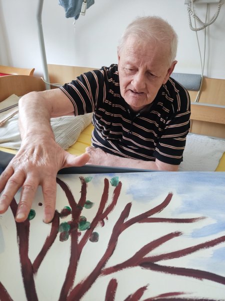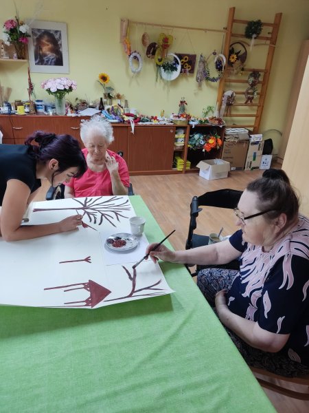 Do tvorby se zapojili všichni klienti. Společně jsme nasbírali a nasušili květiny a listy ze zahrady, které se staly součástí obrazu. Aby se mohli zapojit i ti, kteří se sběru nemohli zúčastnit, vytvořili jsme strom, na který každý klient obtiskl svůj prst namočený v zelené barvě. Za každého tak na stromě vyrostl jeden lístek – symbol společné práce a sounáležitosti.