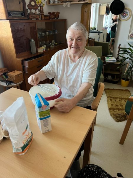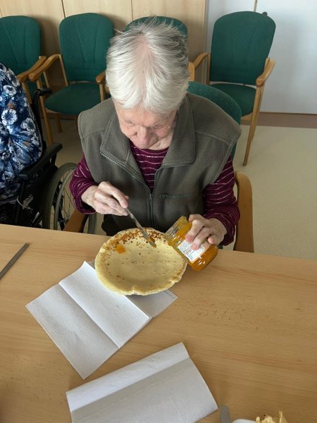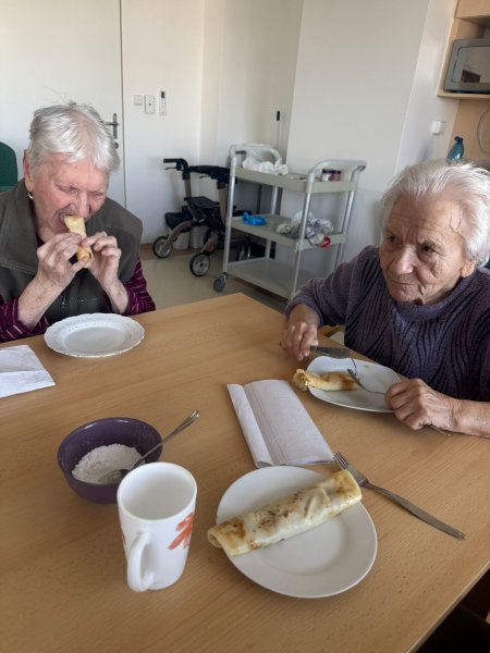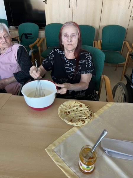Tentokrát se společně s pečovatelkami pustili do přípravy palačinek. Klienti pomáhali s přípravou těsta, smažením i servírováním a poté si na čerstvých palačinkách společně pochutnali. Atmosféra byla příjemná a plná sdílené radosti z vlastnoručně připraveného jídla.