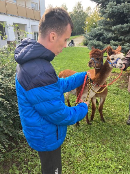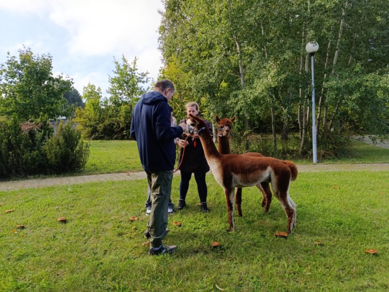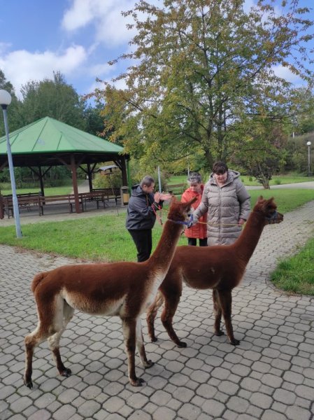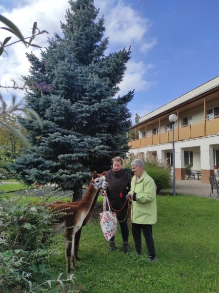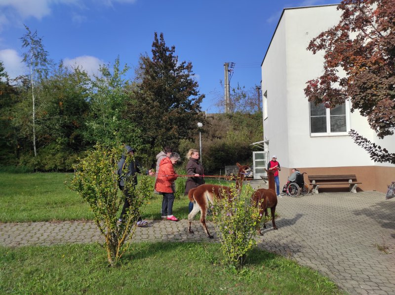 V našem domově proběhla netradiční a velmi milá návštěva. Dorazily k nám alpaky Piškot a Skořice. Během alpakaterapie měli naši klienti možnost se s těmito klidnými a přátelskými zvířaty pomazlit, pohladit je a strávit s nimi čas venku na zahradě. Alpaky svou jemnou povahou přirozeně navozují pocit klidu, bezpečí a radosti, což se odrazilo i na tvářích všech přítomných. Nechyběl smích, doteky a spousta pozitivní energie. Pro mnohé to byl nezapomenutelný zážitek, který zpestřil běžný den a přinesl do našeho domova kousek přírody a pohody.