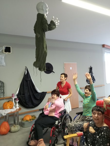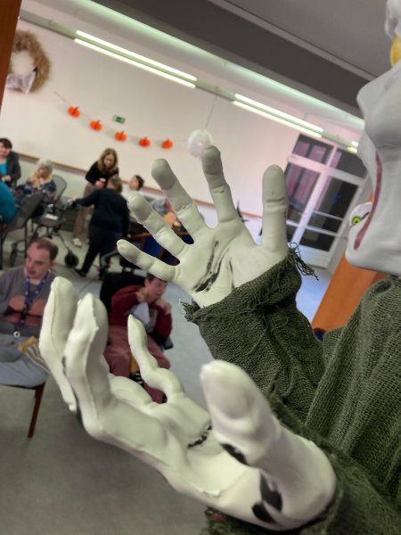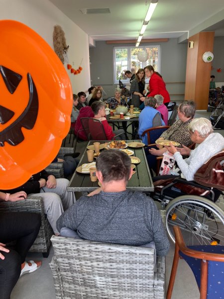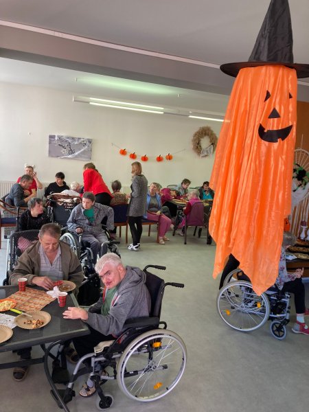 Letos jsme si společně připravili kouzelnou oslavu Halloweenu. Pracovníci domova spolu s klienty se pustili do přípravy tematické výzdoby, která okamžitě navodila tajemnou atmosféru. Dýně, pavučiny, netopýři a strašidelné postavy byly rozmístěny po celém domově a všude vládla veselá nálada. Během oslavy se podával horký mošt, k tomu se skvěle hodila domácí pizza, kterou jsme vytvořili v naší kuchyni. Klienti se podíleli na přípravě sladkých zákusků, váleli těsto, přidávali ingredience a samozřejmě si pak na výsledku pochutnali. Každý měl možnost podílet se na pečení dobroty, ať už to byly cupcakes, perníčky nebo sladké řezy. Hudba, která se nesla celým domovem ještě více přispěla k veselí. Zahráli jsme oblíbené písně a nechyběl ani tanec. Někteří klienti se odhodlali k spontánnímu pohybu, jiní se rádi přidali svým zpěvem. Atmosféra byla opravdu živá, plná smíchu a radosti. Na oslavě se objevil i kouzelný čaroděj s hůlkou, který každého zúčastněného „začaroval“. Všichni se smáli, když čaroděj procházel kolem a vyslovoval zaklínadla, která prý přinášejí štěstí a pohodu. Bylo to krásné odpoledne, které si budeme pamatovat ještě dlouho.