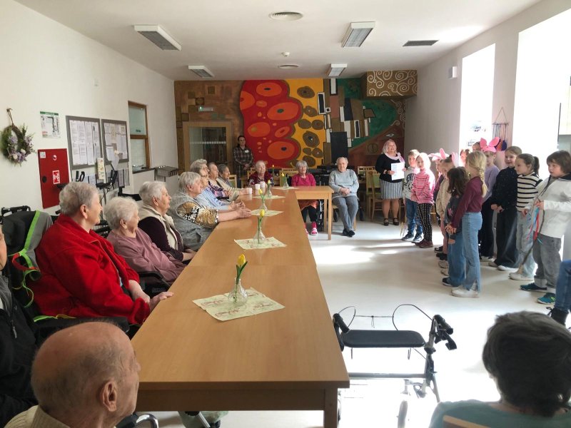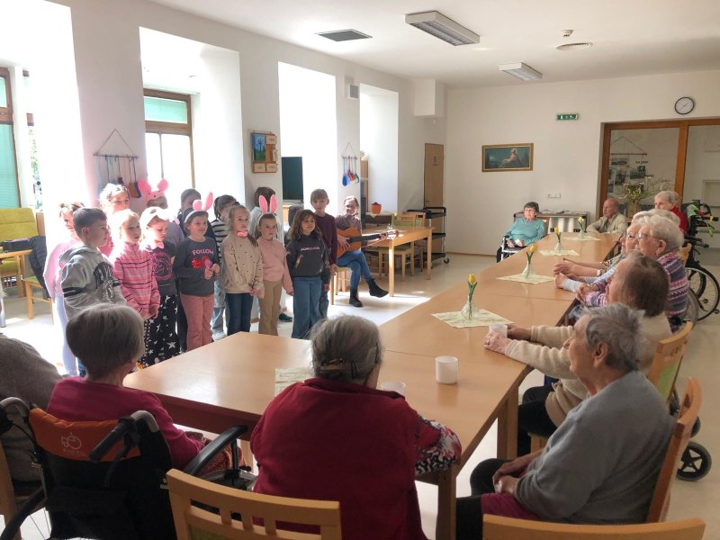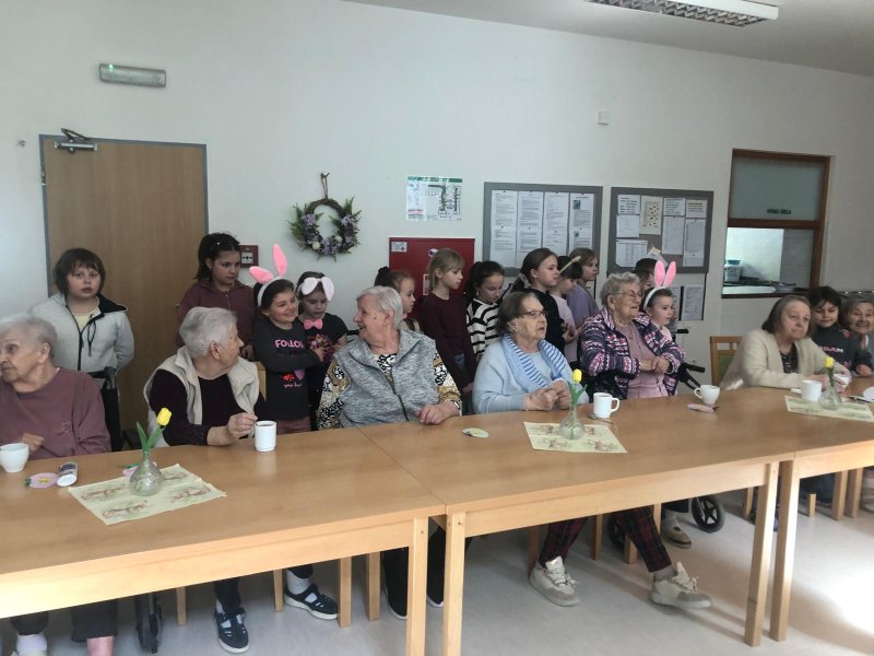 Podobně milé setkání plné jarní atmosféry zažili také klienti v Domově pro seniory v Uherském Ostrohu, kam zavítaly děti ze ZŠ Uherský Ostroh s velikonočním vystoupením. Děti přednesly básničky, zazpívaly písničky a každého klienta obdarovaly vlastnoručně vyrobeným přáníčkem Nezůstalo však jen u společného programu – děti navštívily také některé klienty přímo na pokojích, kde jim zazpívaly a osobně předaly přání. Toto pozorné gesto přineslo mnoho radosti a dojetí. Klienti si vystoupení velmi užili a ocenili především jeho srdečnost a blízkost. Na příjemnou atmosféru navázalo společné posezení u kávy a jednohubek, které si klienti sami dopoledne připravili.