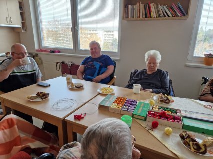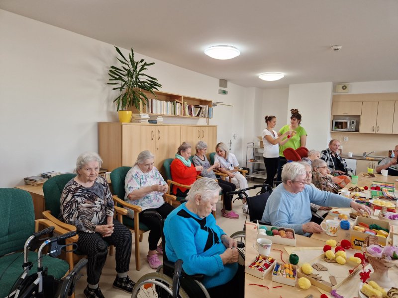 V neděli bylo v Domově pro seniory Uherské Hradiště opět o zábavu postaráno. Jedné z pracovnic se totiž do rukou dostalo větší množství vln a bavlnek. Pro někoho jsou to v dnešní době bezcenné předměty po babičce, ne ale pro toho, kdo pracuje v domově pro seniory a v domově se zvláštním režimem. Nedělní odpoledne tak bylo tvořivé a vzpomínkové. Kdo měl chuť, zapojil se do tvoření, nebo si v přítomnosti ostatních vypil odpolední kávu. A aby byla atmosféra ještě lepší, doplnily ji pracovnice vlastnoručně napečenými buchtami a všichni si společně k posezení zazpívali.
