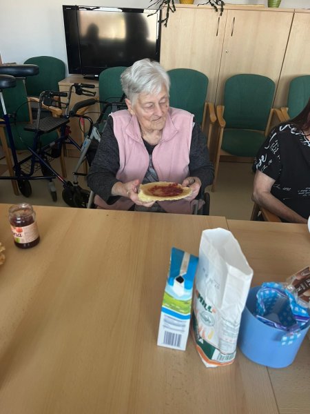 Tentokrát se společně s pečovatelkami pustili do přípravy palačinek. Klienti pomáhali s přípravou těsta, smažením i servírováním a poté si na čerstvých palačinkách společně pochutnali. Atmosféra byla příjemná a plná sdílené radosti z vlastnoručně připraveného jídla.