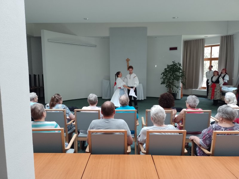 V Domově pro seniory v Uherském Hradišti vystoupil „Ženský sborek Hradišťanky“ s tanečními páry FS Cifra. Vzhledem k velmi horkému počasí jsme akci nakonec udělali v klimatizované společenské místnosti, což ocenili nejen naši klienti, ale vystupující v kroji. Bylo to krásné odpoledne, kterého se zůčastnili i rodinní příslušníci našich klientů. Všichni máme radost z takto společně trávených chvil.