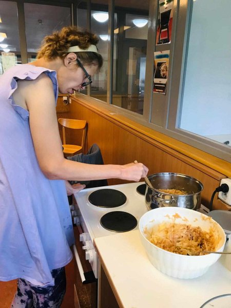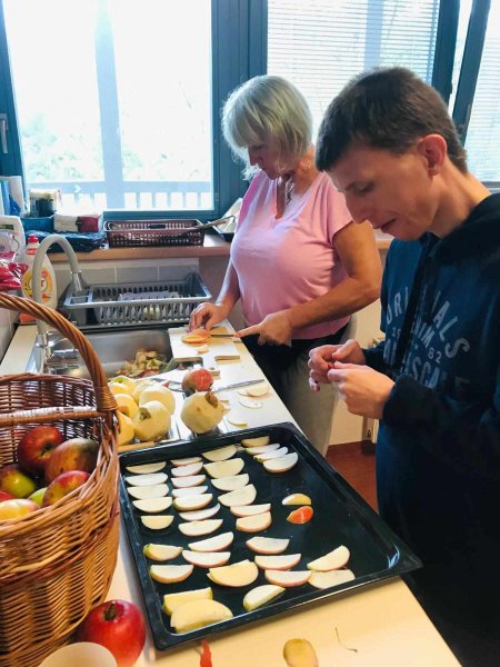 Stromy plné jablek, které rostou kolem celého Domova využili klienti v rámci aktivizace k tomu, aby jablka natrhali a následně si z nich upekli štrúdl a jablečný dort. Část jablek usušili a ze zbytku si vytvořili jablečnou šťávu. Z fotek lze vidět, že klienti se do takových aktivit vrhají s nadšením.