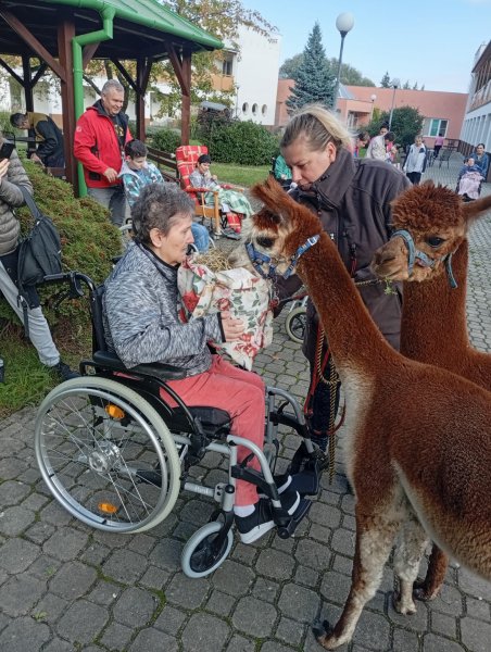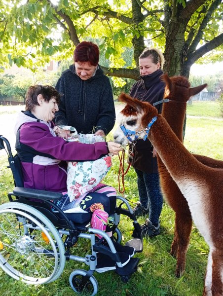 V našem domově proběhla netradiční a velmi milá návštěva. Dorazily k nám alpaky Piškot a Skořice. Během alpakaterapie měli naši klienti možnost se s těmito klidnými a přátelskými zvířaty pomazlit, pohladit je a strávit s nimi čas venku na zahradě. Alpaky svou jemnou povahou přirozeně navozují pocit klidu, bezpečí a radosti, což se odrazilo i na tvářích všech přítomných. Nechyběl smích, doteky a spousta pozitivní energie. Pro mnohé to byl nezapomenutelný zážitek, který zpestřil běžný den a přinesl do našeho domova kousek přírody a pohody.