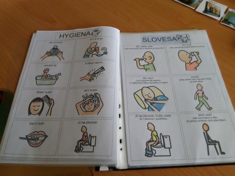 • Komunikační tabulky a knihy s obrázky, symboly nebo slovy, které klient ukazuje, aby vyjádřil své potřeby