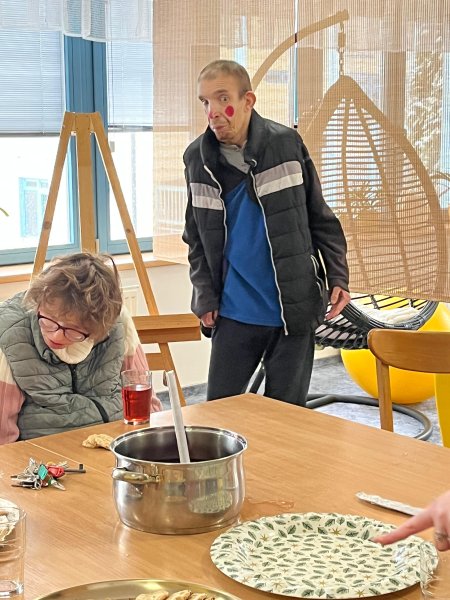 V Domově pro osoby se zdravotním postižením na Velehradě - Buchlovská zahájili dopoledne tradiční masopustní obchůzkou. Klienti spolu s pracovníky prošli celé zařízení v rozmanitých maskách. Na chodbách se ozýval zpěv, smích i hudba. Nechybělo ani taneční veselí. Na jednotlivých komunitách si pro průvod připravili malé pohoštění, kde se všichni mohli během obchůzky zastavit, odpočinout a doplnit energii. Odpoledne proběhla nácvičná kavárna, také zdobená i vedená v masopustním duchu. Klienti si mohli pochutnat na čerstvých koblížcích, které k masopustu neodmyslitelně patří, a také na chlebu s mandlovou paštikou a naším domácím chutney.