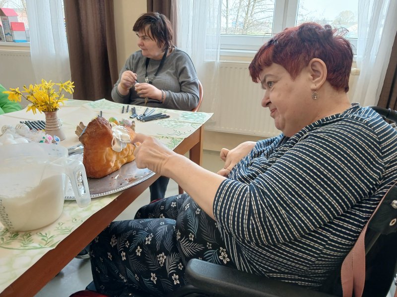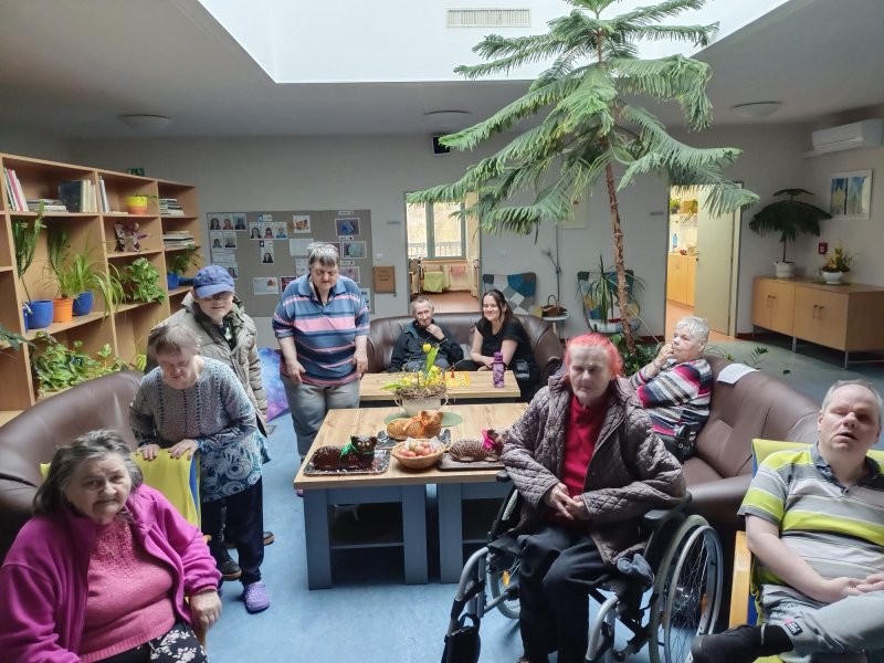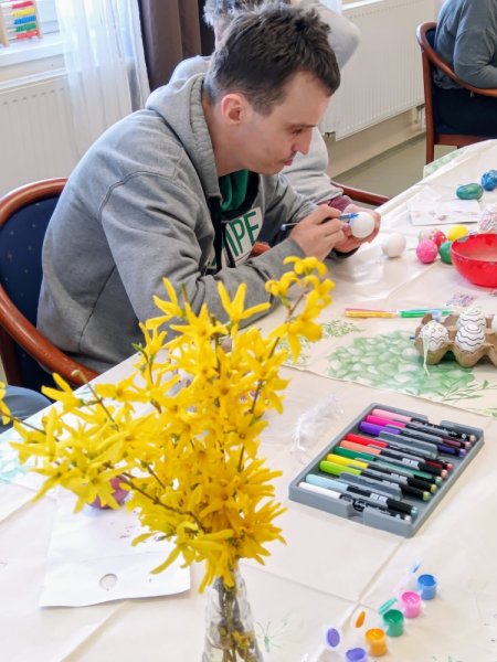 Také ve Velehradě na Buchlovské se klienti aktivně zapojili do velikonočních příprav. Společně vytvářeli tematickou výzdobu a nechybělo ani pečení tradičních velikonočních beránků. Součástí programu byla i dílna zaměřená na výrobu dekorací, která klientům umožnila rozvíjet kreativitu a podílet se na výzdobě svého domova. A v Kunovicích na Cihlářské klienti společně s pracovnicemi rovněž vyráběli velikonoční přáníčka a dekorace a měli možnost vyzkoušet si různé výtvarné techniky. I zde se potvrzuje, že právě zapojení do smysluplných činností přináší radost i pocit užitečnosti.