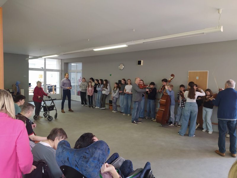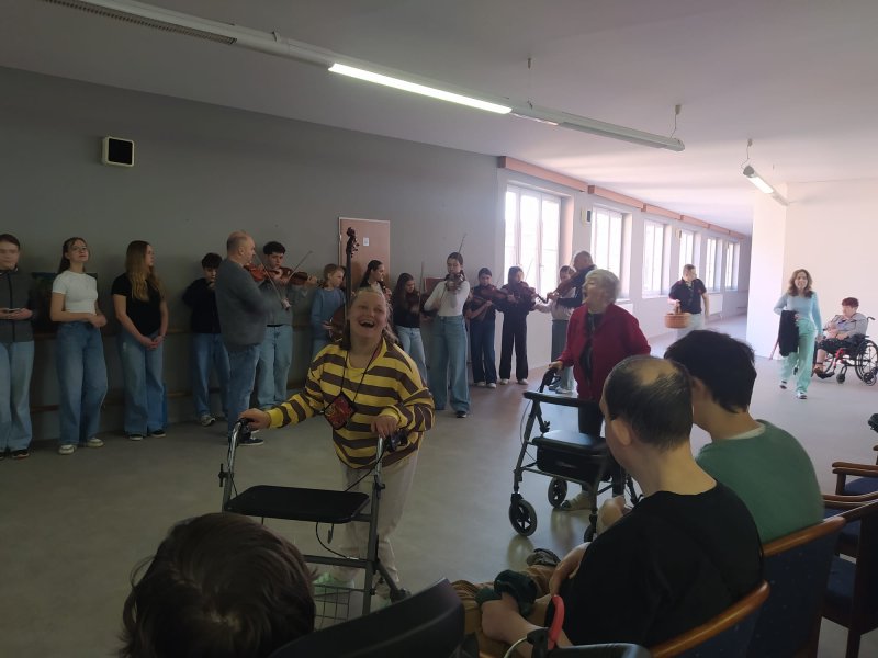 Do Domova pro osoby se zdravotním postižením ve Starém Městě dnes zavítali žáci a učitelé ze ZŠ Staré Město, aby společným zpěvem a hrou na housle připomněli blížící se jaro a Velikonoce. Klienti si vystoupení náramně užili – živá hudba je nadchla natolik, že se někteří sami nadšeně zapojili a gesty předváděli hru na nástroje i zpěv. Za toto milé setkání patří škole poděkování.